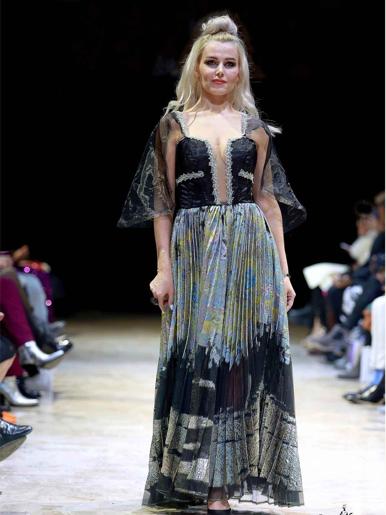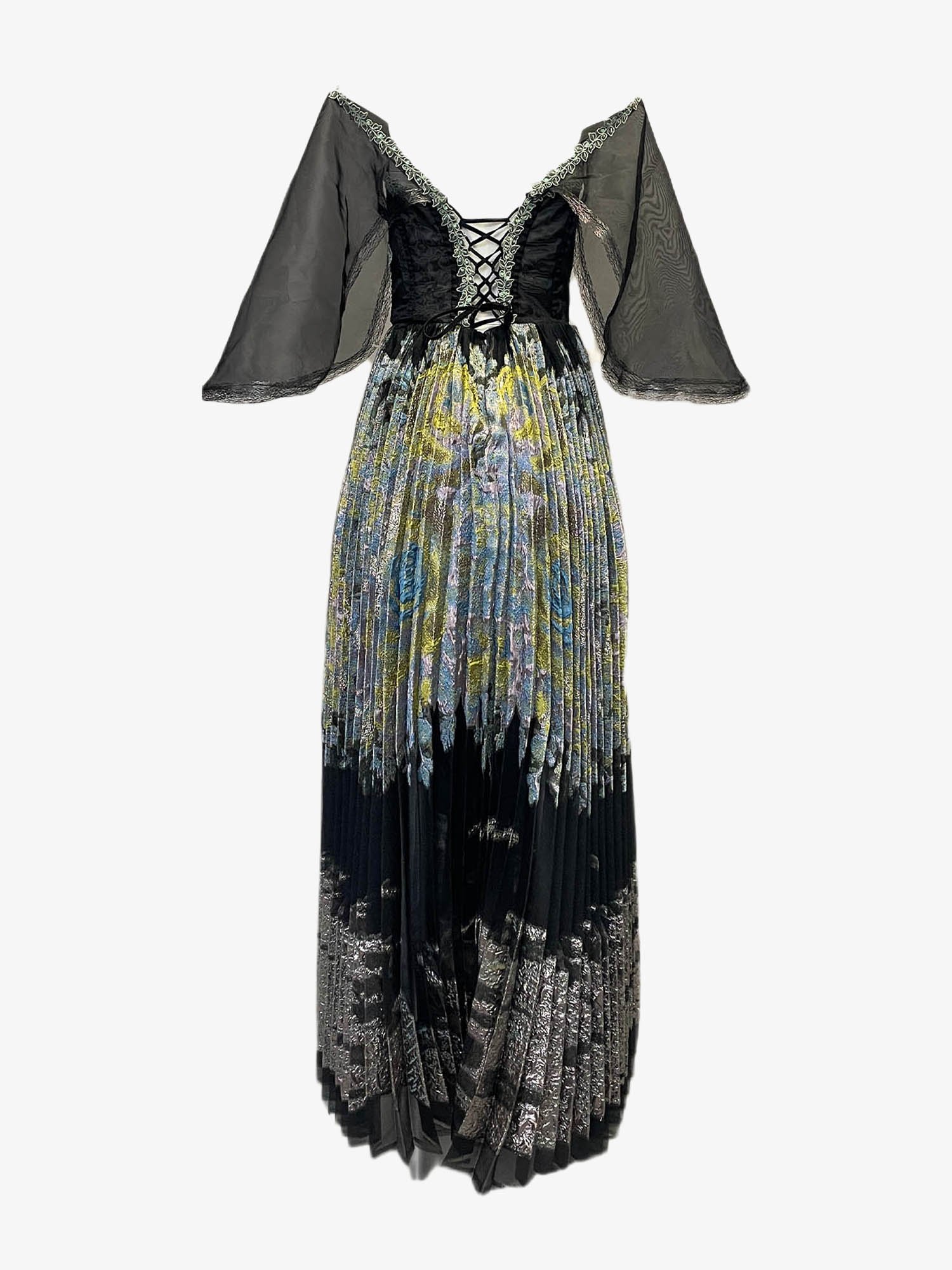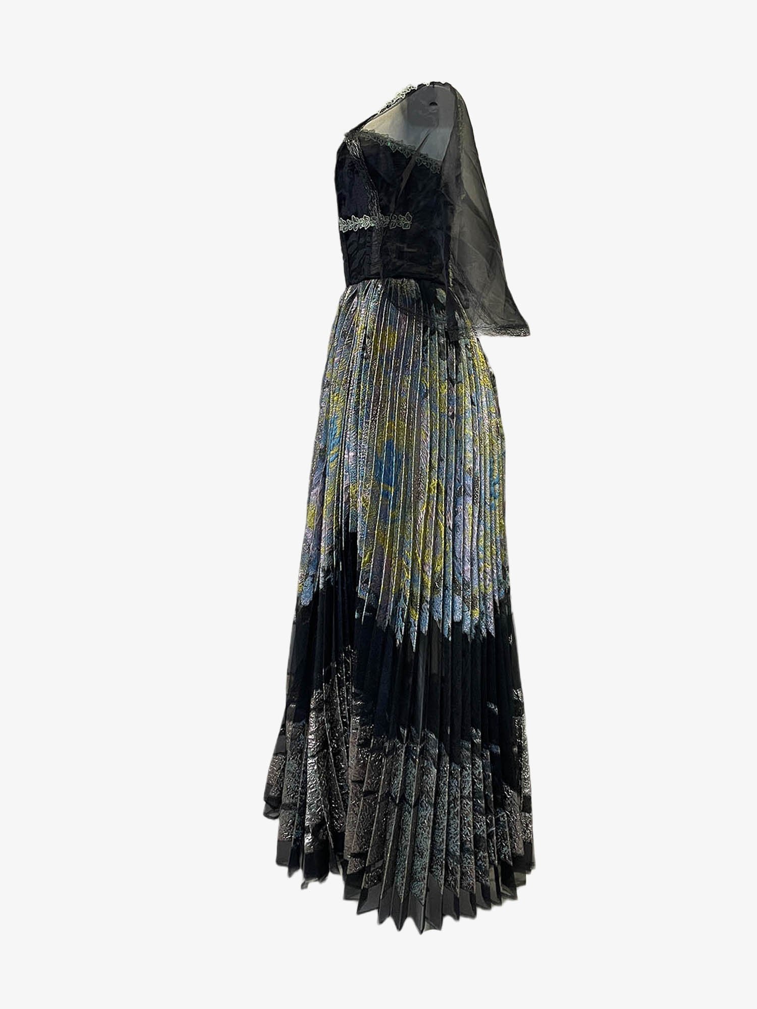 Organza embroidered corset gown with a pleated metallic colored skirt.