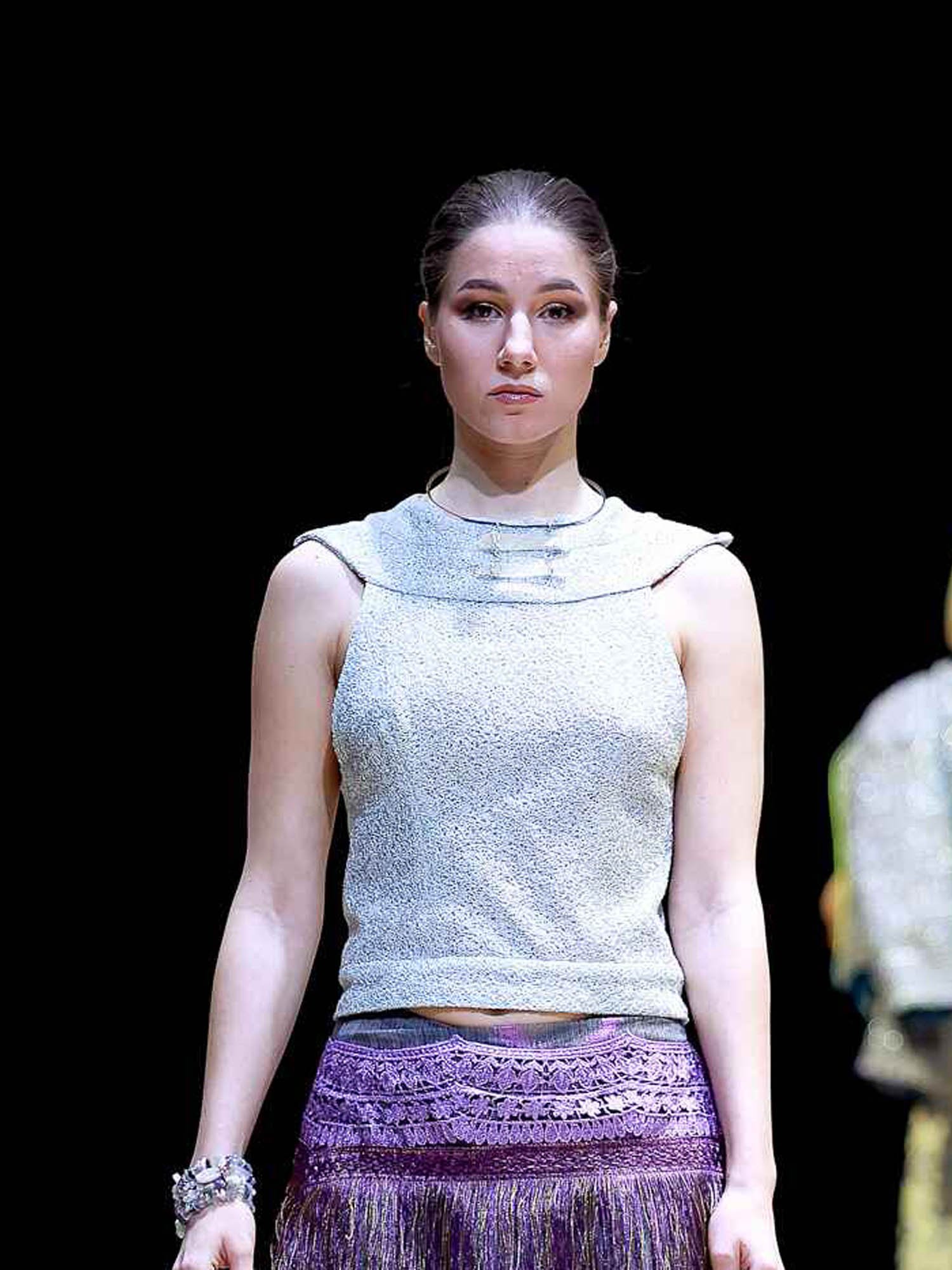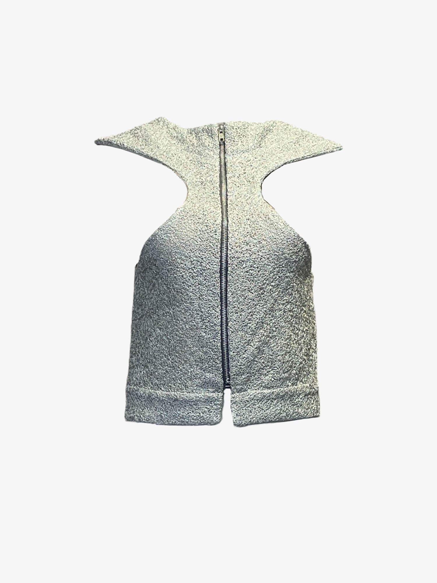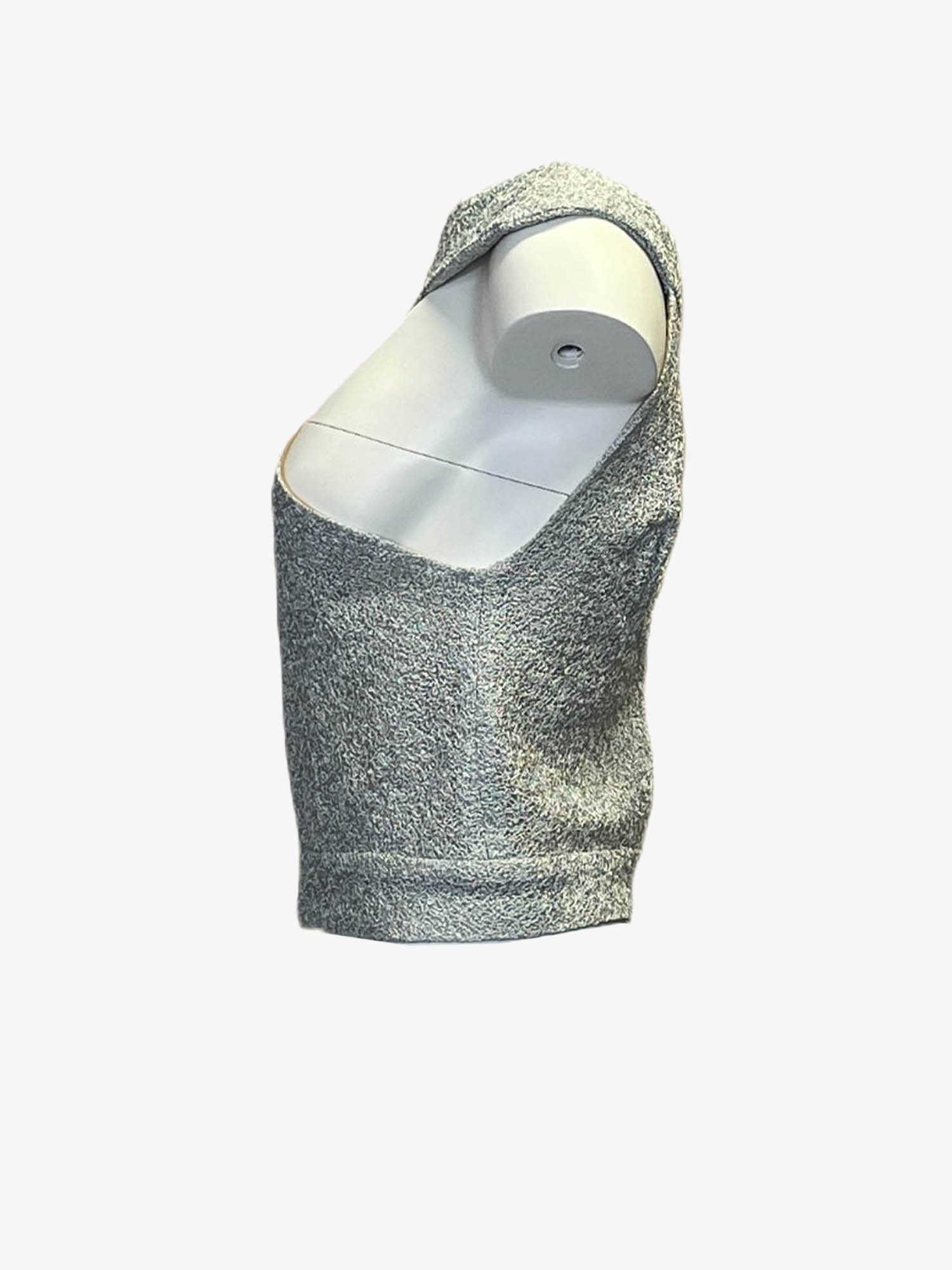 Mixed blend lace top, crafted from 100% wool, and lined with 100% poly chiffon.