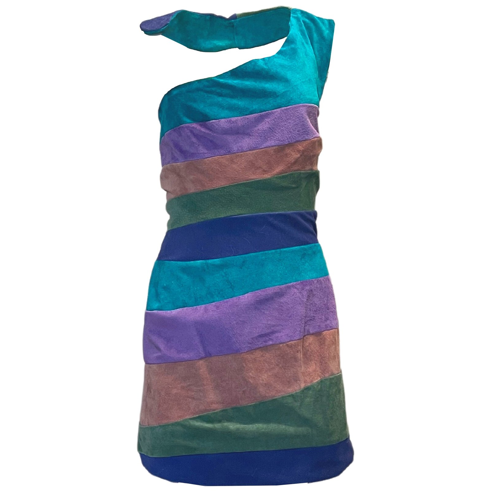 MULTICOLORED DRESS, 100% LEATHER. UNUSUAL SPIRAL DESIGNS, NO SIDE SEAMS, LINED WITH SATIN.