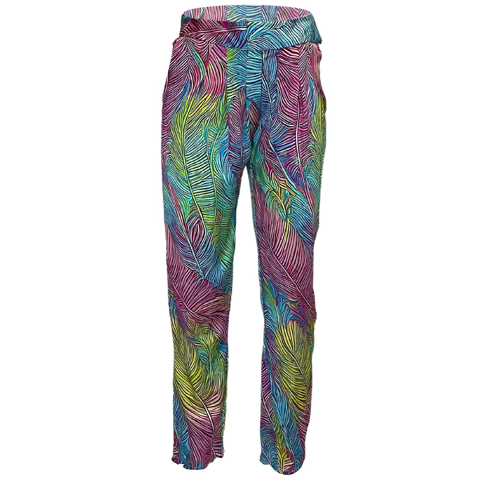 CUSTOM-PRINTED PLEATED NARROW PANTS, 100% SILK CHARMEUSE. FEATURING RARE ARTISTIC PRINT, ONE POCKET, AND FINISHED FRENCH SEAM FINISHES.