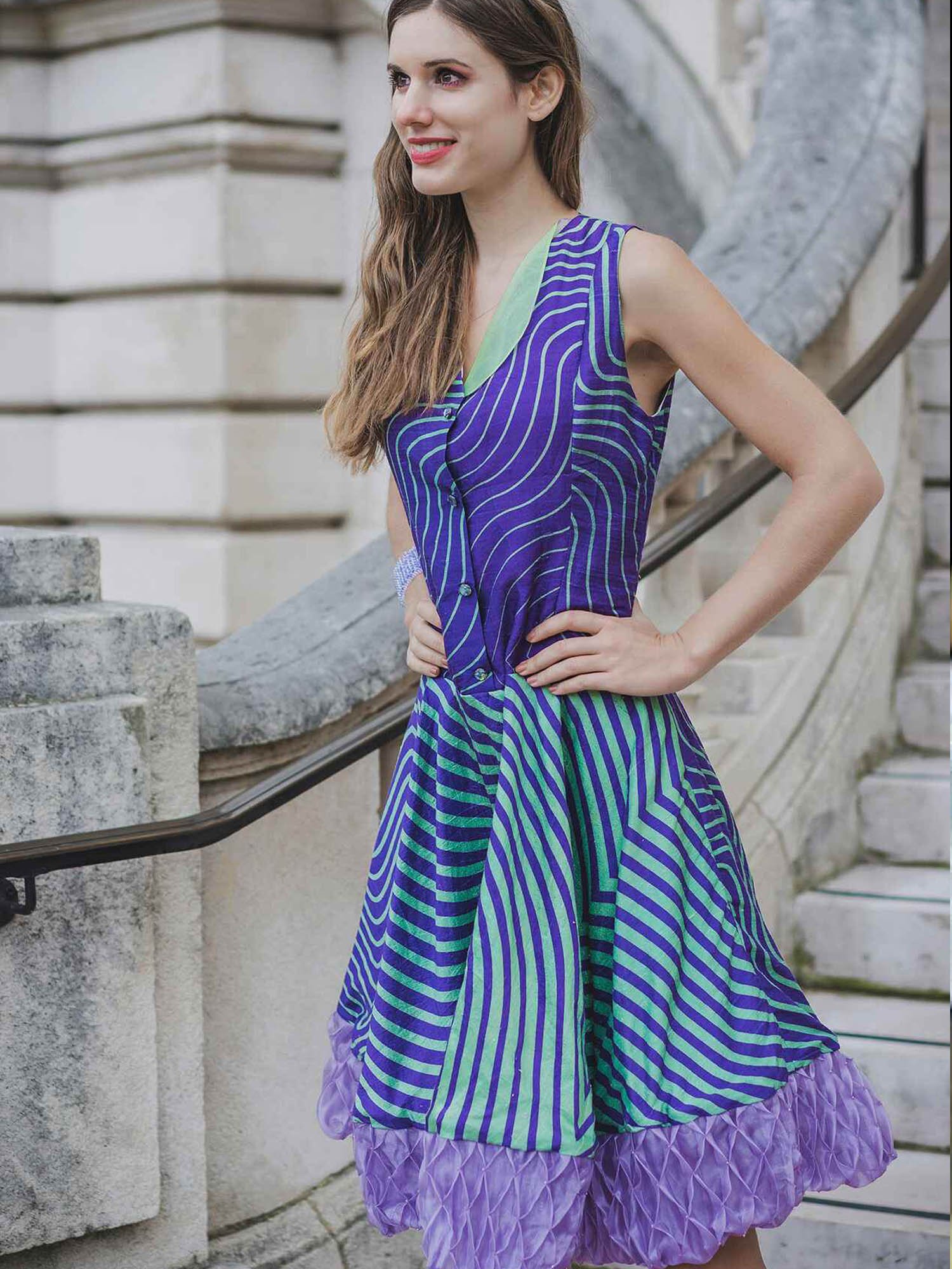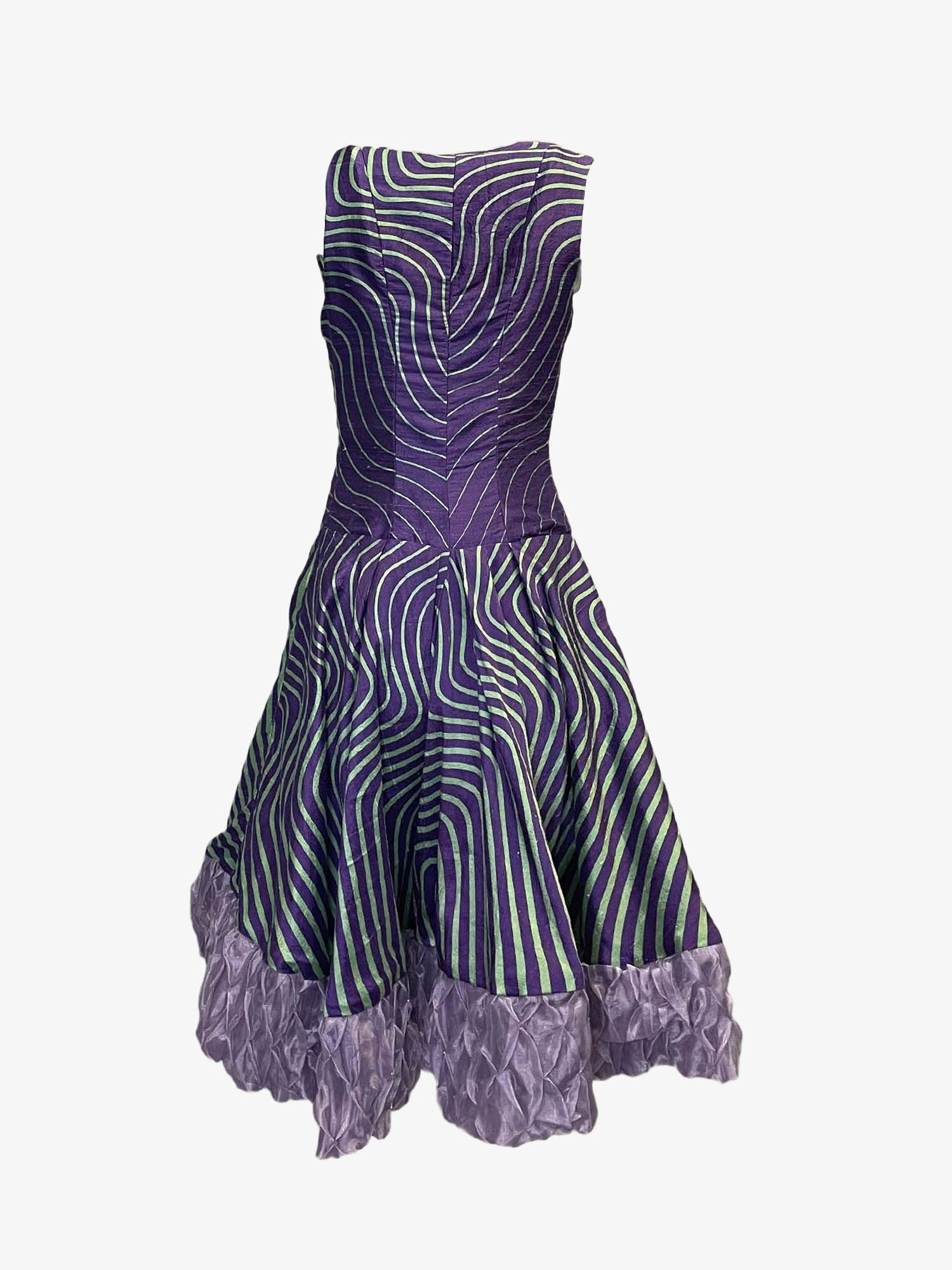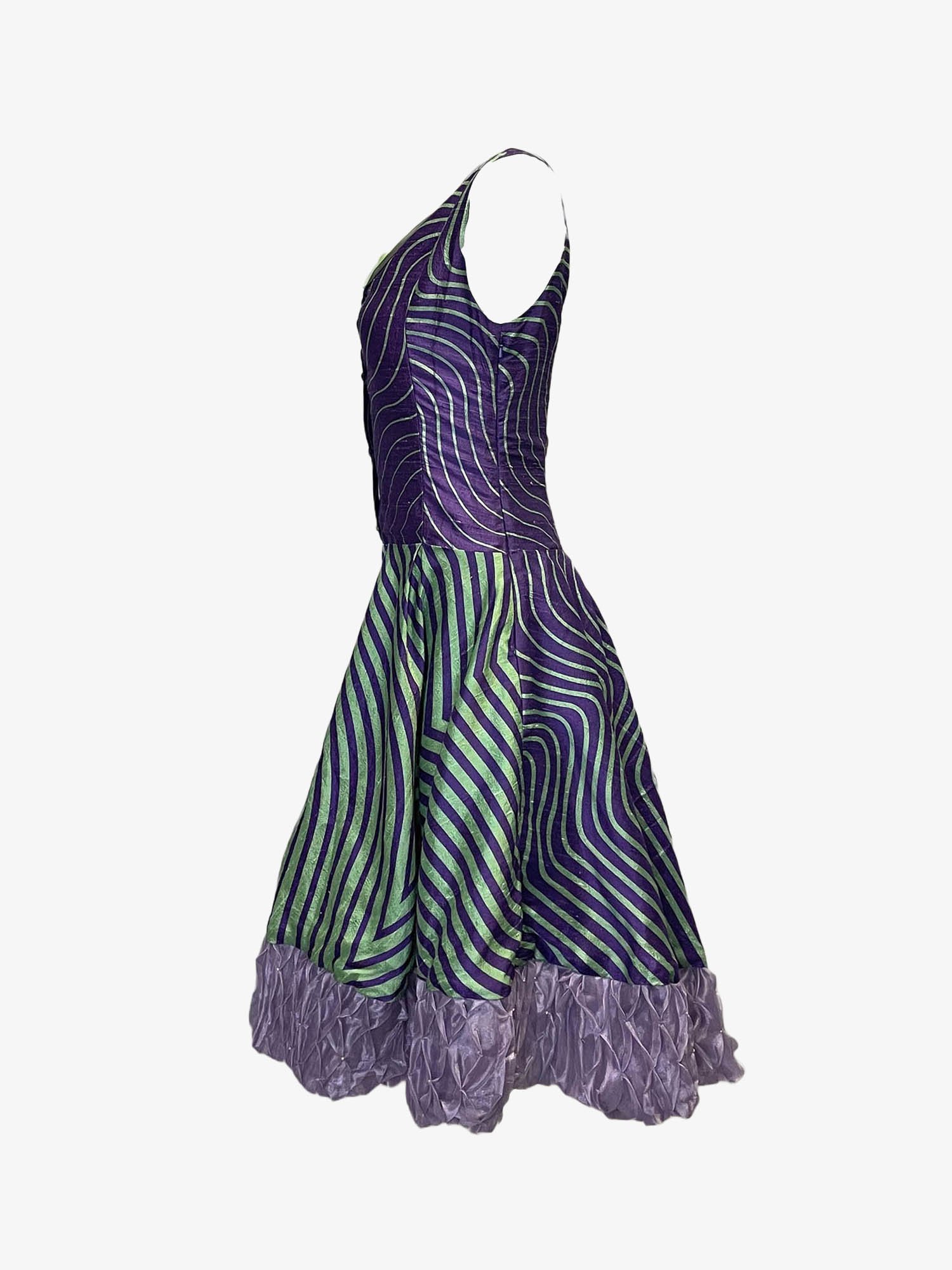 Printed silk dress, crafted from 100% silk Indian dupion. Featuring rare geometric print, hand embroidered organza hem detail, and lined with silk.