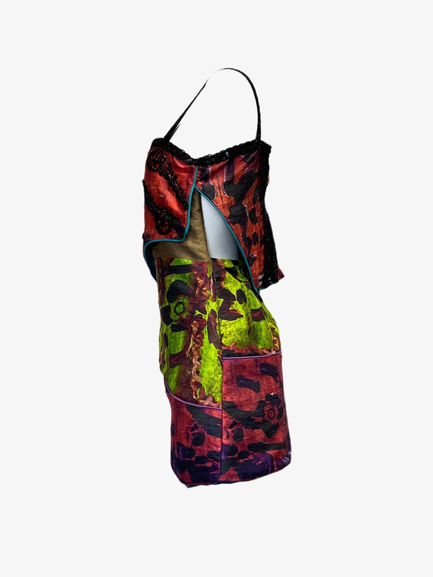 Multi-color silk dupion cocktail dress with vintage lace and piping details.