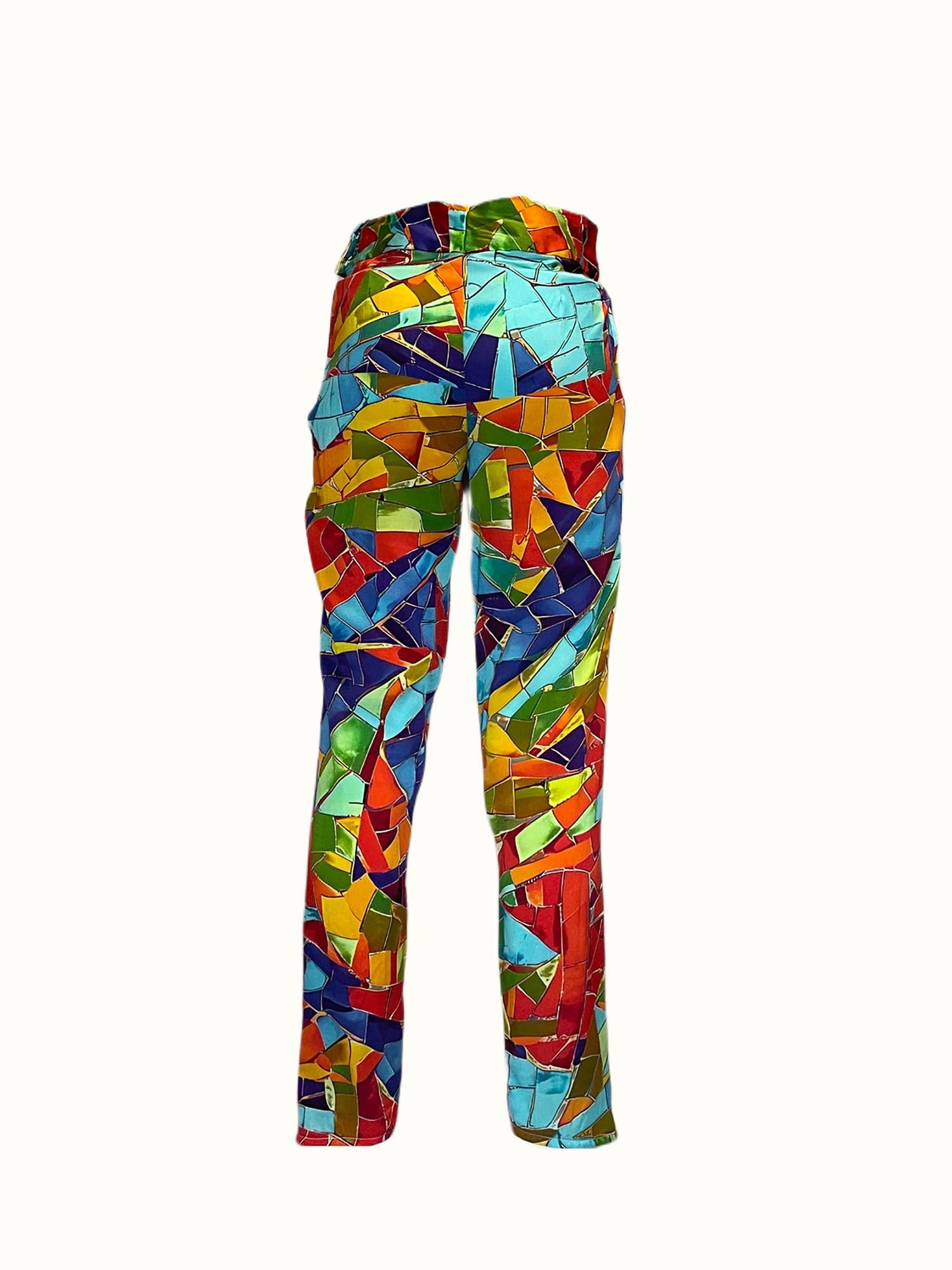 Custom-printed pleated narrow pants, crafted from 100% silk charmeuse. Featuring a rare artistic print and finished with elegant French seam finishes.